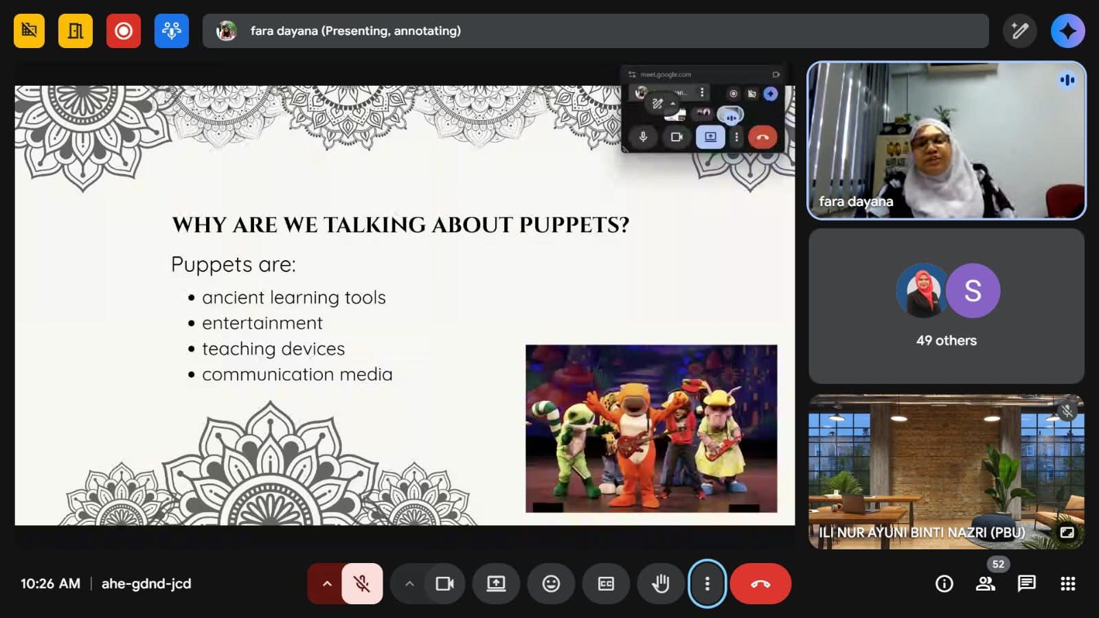 The session, themed “Puppetry as a Tool for Knowledge Transfer: Storytelling, Language, and Communication,” highlighted the role of puppetry as an effective pedagogical and creative medium in enhancing language learning, storytelling techniques, and communication skills. Drawing from her academic and artistic expertise in drama and theatre, Dr. Fara Dayana shared insights on how performative arts—particularly puppetry—can be integrated into educational contexts to foster engagement, creativity, and meaningful knowledge transfer.
