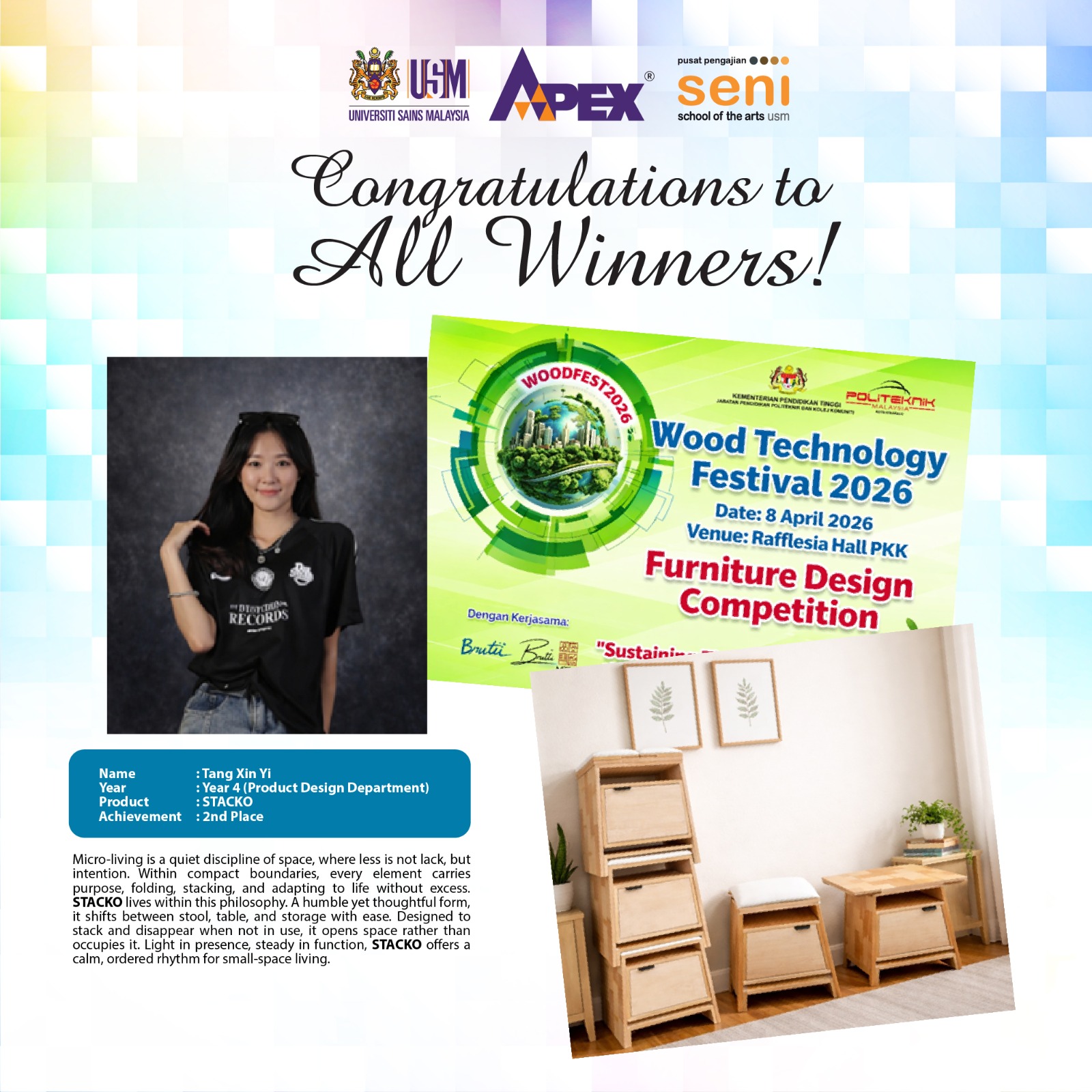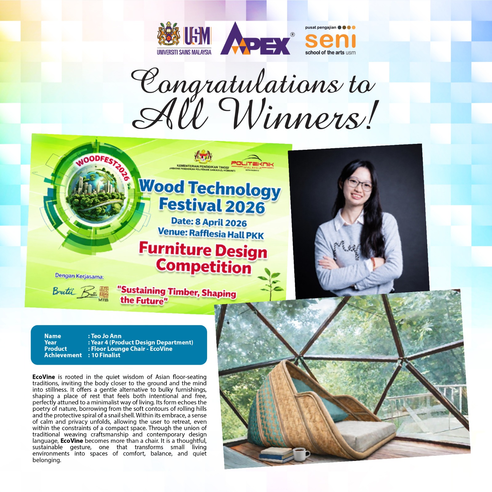 We are incredibly proud to announce that students from the School of the Arts (SOTA), USM, dominated the Furniture Design Competition held during the Wood Technology Festival 2026. Hosted at Rafflesia Hall PKK on 8 April 2026, the festival operated under the inspiring theme "Sustaining Timber, Shaping the Future". Our Product Design students showcased their ability to merge traditional craftsmanship with modern needs, taking home top honors against stiff competitionย