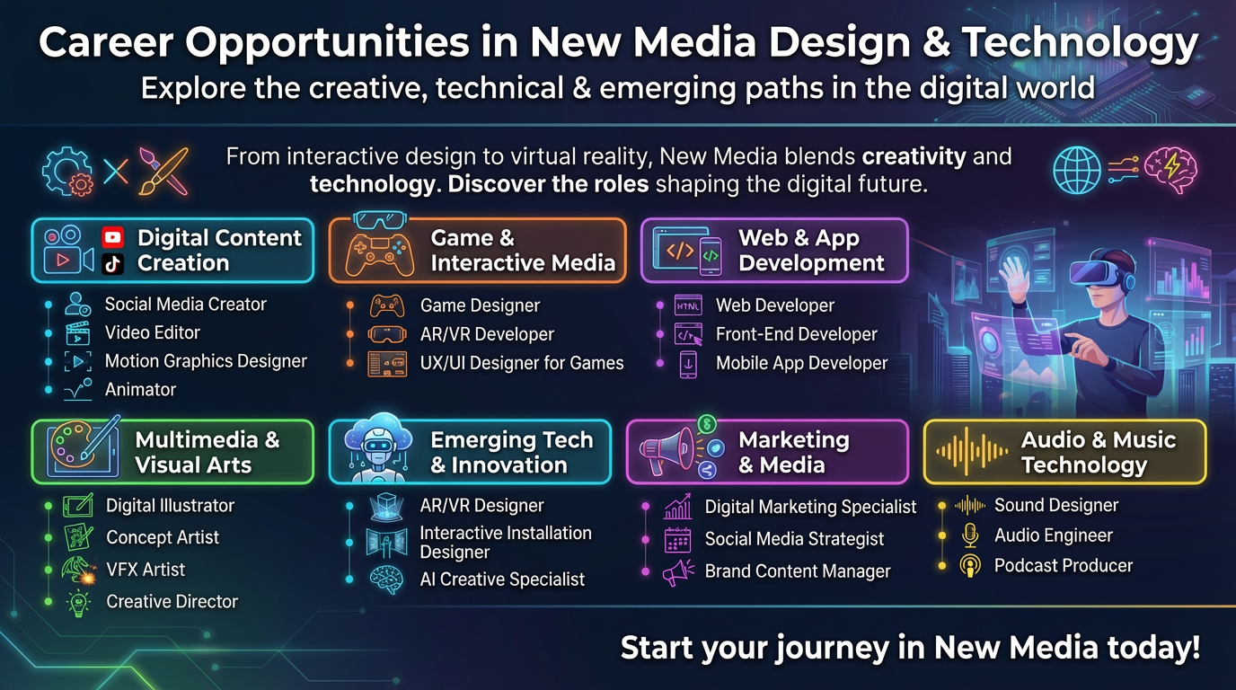 Graduates of the program are well-equipped to pursue careers in a wide range of industries, including advertising, marketing, gaming, education, and entertainment. They can work as web and app developers, UX designers, multimedia specialists, digital media producers, and more. With the rapid growth of digital media, the Bachelor of Fine Arts in New Media Design and Technology with Honours is an excellent choice for students who are passionate about technology and creativity and want to make an impact in the digital world.